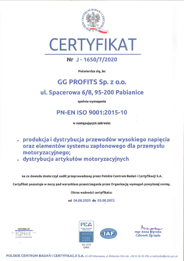 Potwierdzeniem jakości jest również certyfikat ISO 9001 wydany przez PCBC oraz Międzynarodowy Certyfikat Jakości IQNet, wyróżniający naszą firmę jako światowego producenta najlepszych przewodów zapłonowych do markowych pojazdów.