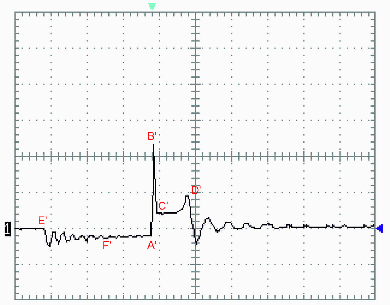 Brak oscylacji na prawo od punktu E' (lub oscylacje o nieznacznej amplitudzie) może świadczyć o tym, że cewka nie została rozładowana podczas przeskoku iskry lub do przeskoku iskry nie doszło.